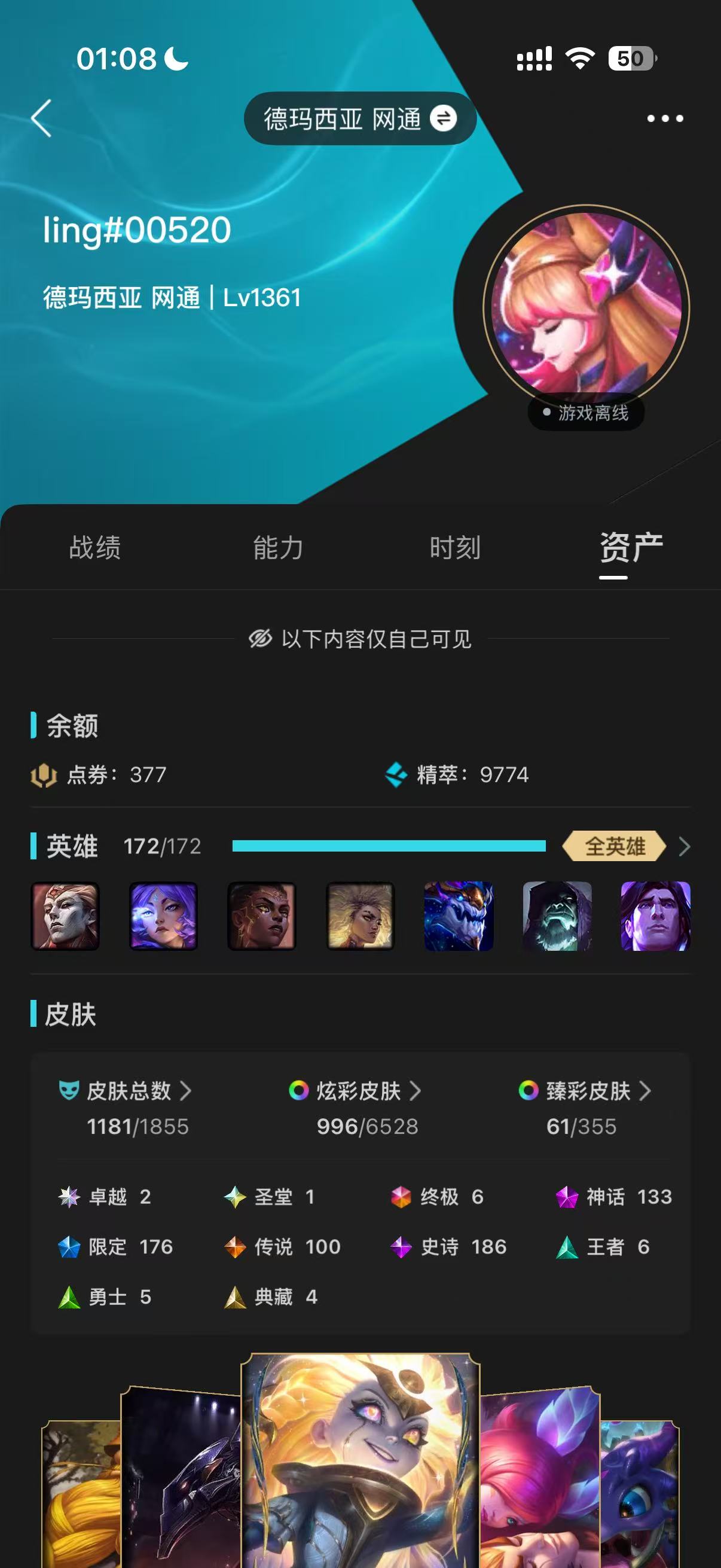 角色等级:1367 角色名:ling 排位赛:允许 单双排段位:璀璨钻石IV 灵活组排段位:流光翡翠I 英雄数量:172 皮肤数量:1199 分销起租时长:2 云顶之弈段位:无段位 双人作战段位:无段位