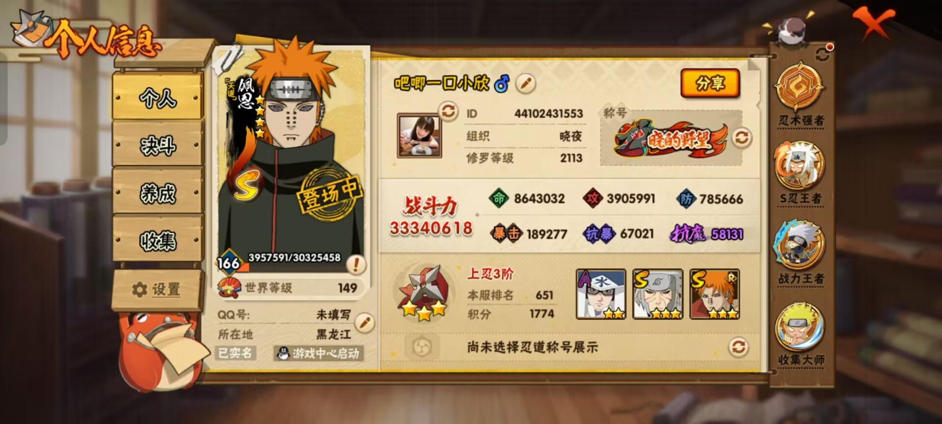 ★几乎全S★52S★V15~92A★3300万战斗力★九喇嘛鸣人★ 漂泊六道佩恩★ 忍战大野木★鲛肌融合★天道超★死门凯★大野木★鸡翅佐助★