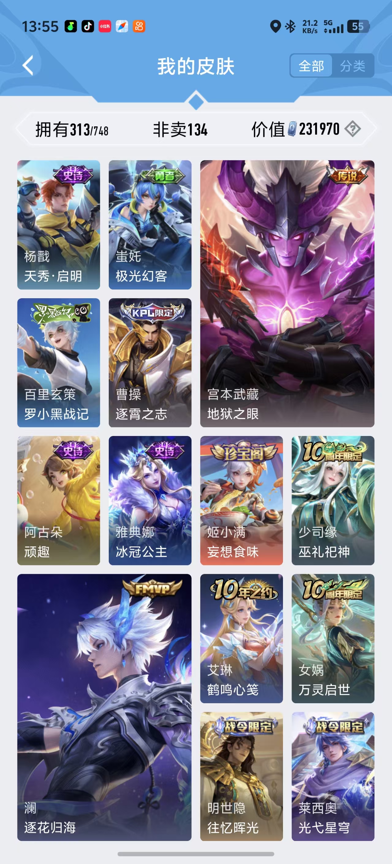 z45-313皮肤-至尊宝,战争女神,地狱之眼,一念神魔,凤求凰,全息碎影,逐花归海,龙胆,神威,晚萤,魅语,暗影游猎,修罗