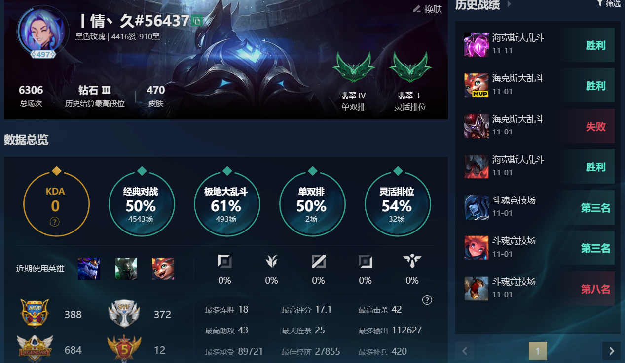 角色等级:503 角色名:丨情丶久 排位赛:允许 单双排段位:流光翡翠III 灵活组排段位:璀璨钻石IV 英雄数量:172 皮肤数量:481 分销起租时长:2 云顶段位:无段位 双人作战段位:无段位