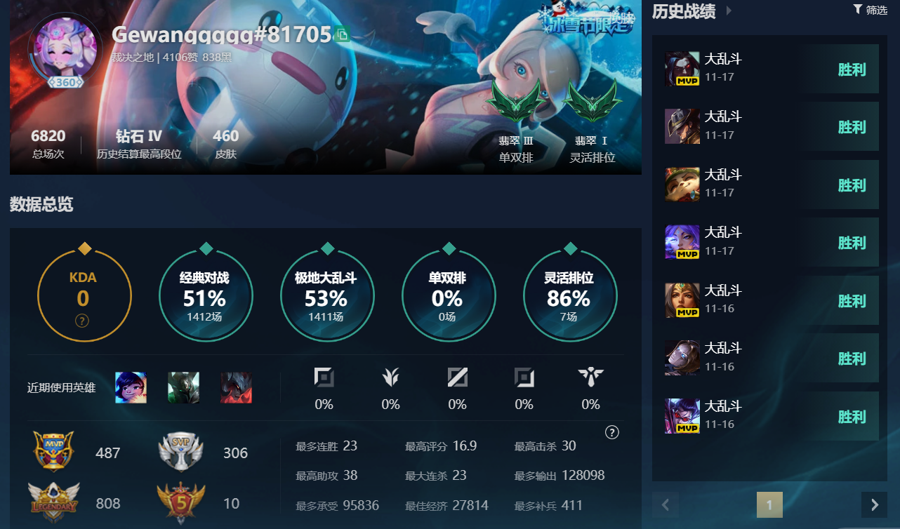 角色等级:363 角色名:Gewanggggg 排位赛:允许 单双排段位:- 灵活组排段位:- 英雄数量:172 皮肤数量:470 分销起租时长:1 云顶段位:无段位 双人作战段位:无段位
