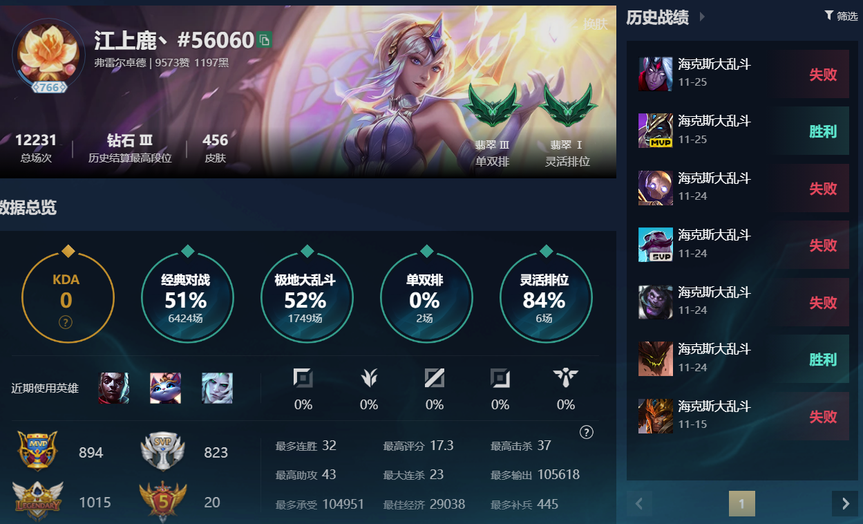 角色等级:769 角色名:江上鹿丶 排位赛:允许 单双排段位:流光翡翠IV 灵活组排段位:- 英雄数量:172 皮肤数量:466 分销起租时长:1 云顶段位:无段位 双人作战段位:无段位