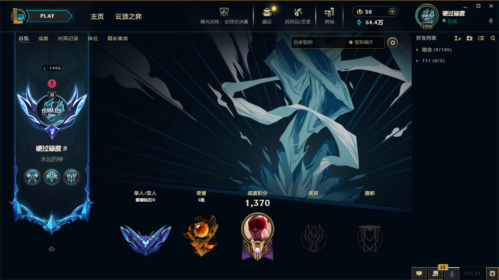 角色等级:2005 角色名:硬过碌蔗 排位赛:允许 单双排段位:璀璨钻石III 灵活组排段位:流光翡翠I 英雄数量:172 皮肤数量:1402 分销起租时长:2 云顶段位:无段位 双人作战段位:无段位