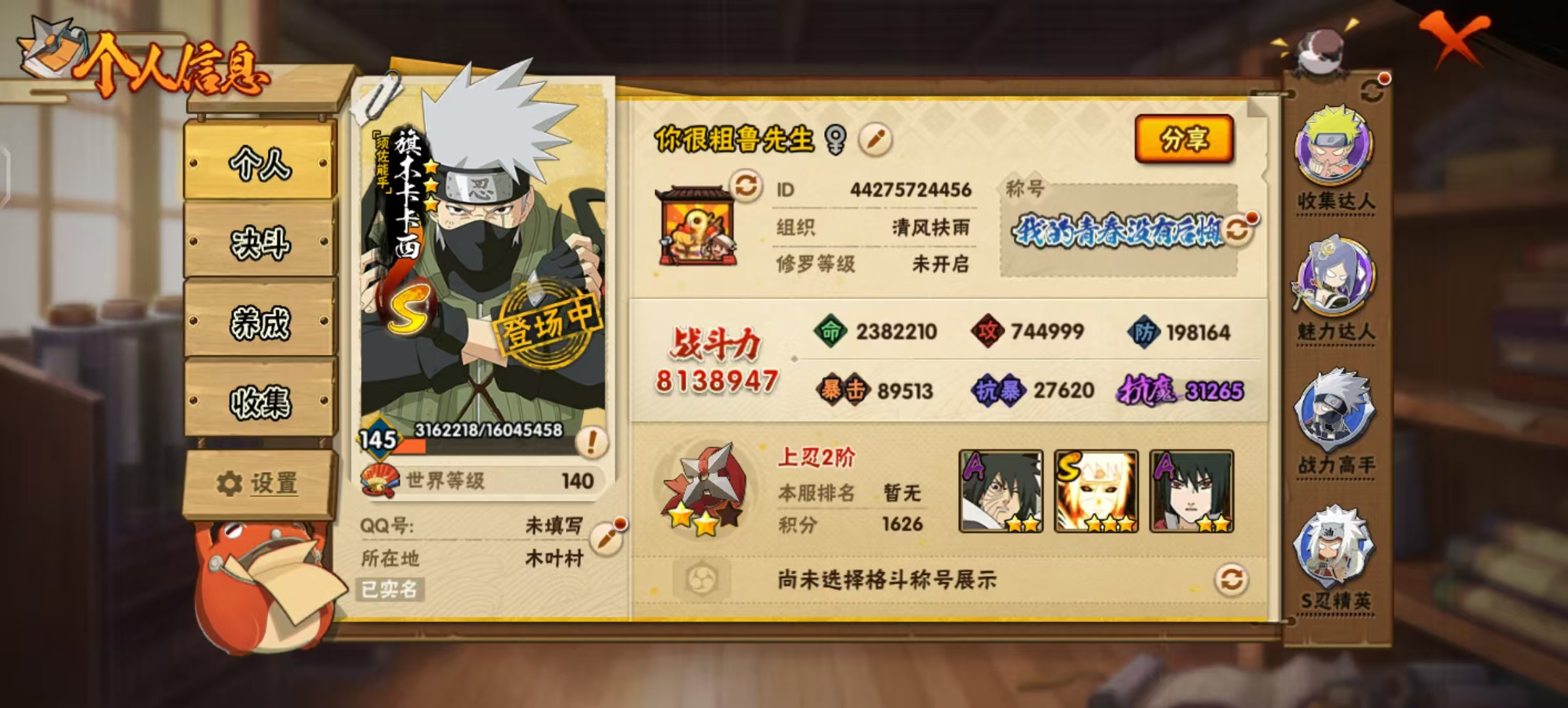 小微微QW542@813W战力丨14S忍全高招,28个高招A忍,一个暴怒带土丨上忍2阶