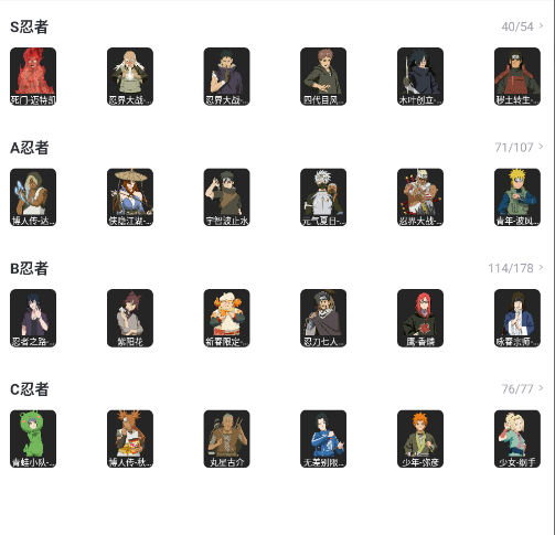 ★40S-70A★2000W战力★妖怪奇谭纲手-侠影佐肋-夏日黑土+时装+奥义★夏日照美冥+时装★夏日卡卡西+时装★夏日鼬★秽土再不斩/新春我爱罗★桃地再不斩-传承奥义★传说自来也★须佐卡卡西★白面具★漂泊佩恩、带土、小南、再不斩★暴怒带土★新春鼬★新春止水