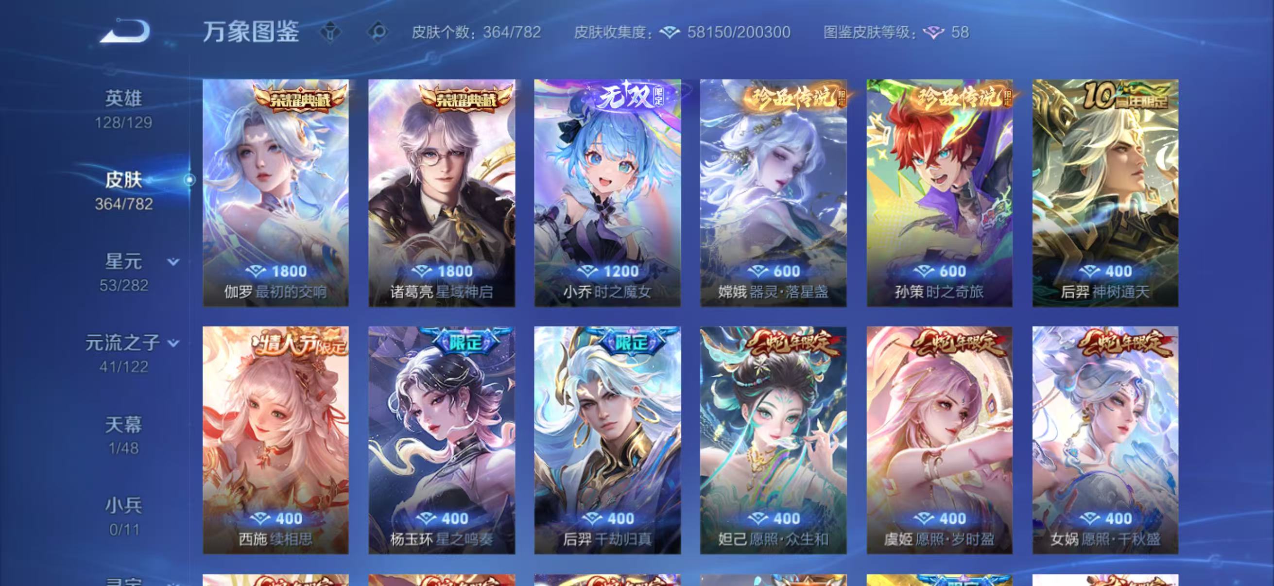 XX113@QQios/贵族9/364皮肤双水晶/星域神启/最初的交响/时之魔女/蛇年全套/千劫归真/器灵·落星盏/时之奇旅/续相思/星之鸣奏/永耀之星/绯月行/等等