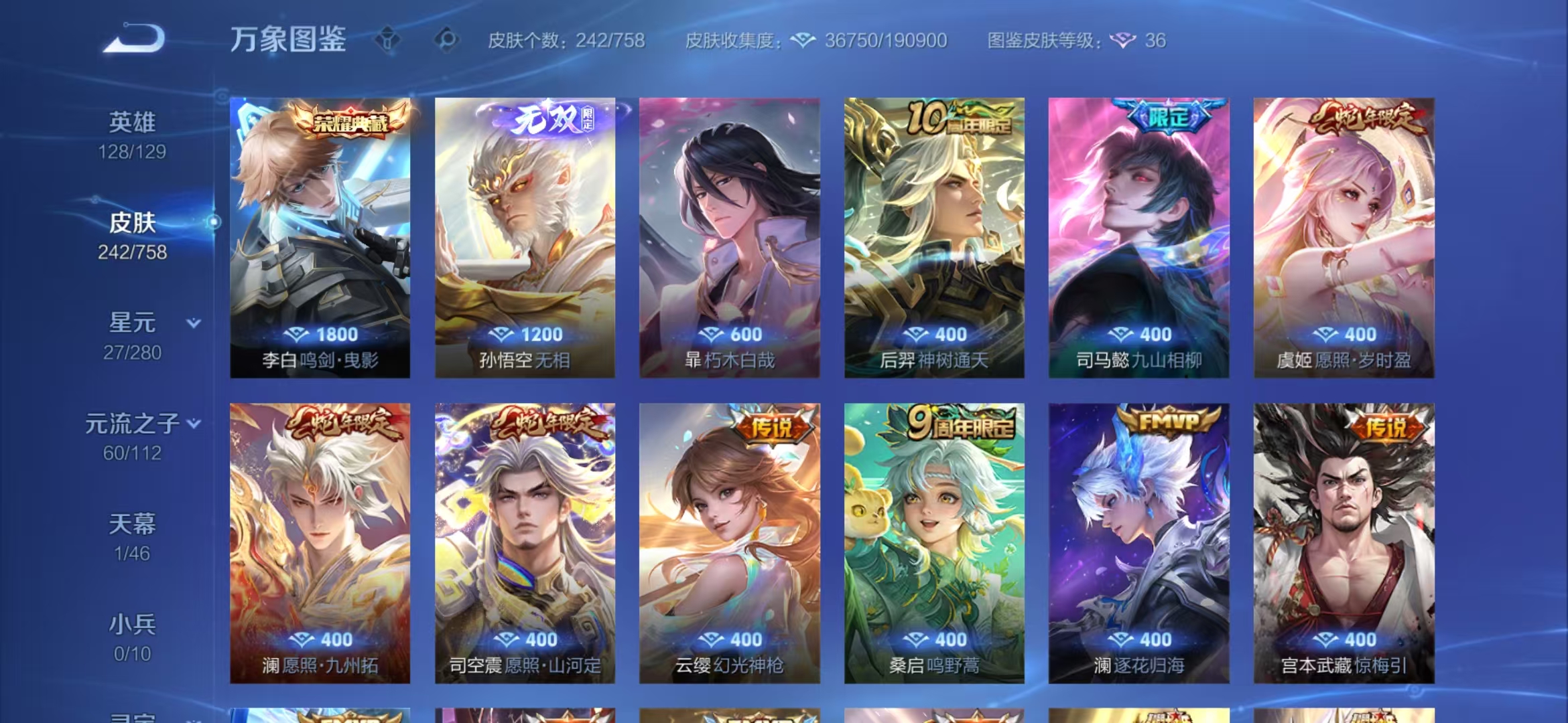 N007,V7,242皮肤,猴子的新皮肤飞的真品传说蓝的逐花归海和蛇年限定司空震全皮虞姬有蛇限李白的荣耀典藏司马懿的限定皮肤共有17个传说30多个限定
