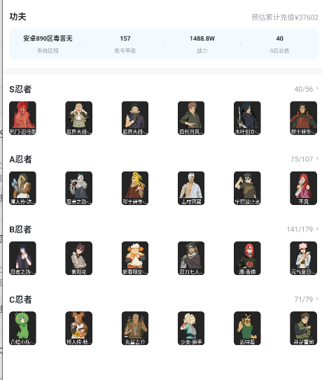 ★40S★75A★1600万战力★六尾鸣人★须佐卡卡西★解斑★青春哥★鲨鱼★天道超★盾狗★