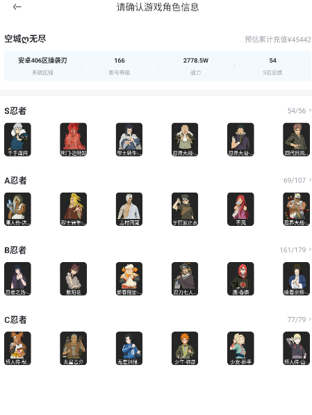 ★54S★69A-2800W战力-点券A:忍战凯|漂泊武士再不斩|漂泊扉间|漂泊小南|新春我爱罗|侠隐纲手|S忍:解斑|九尾连结鸣人|永恒佐助|忍战小樱|创立柱间|金氏|死门凯|木叶创立斑|天道★超|忍战带土|宇智波斑|秽土斑|秽土鼬|须佐鼬|秽土柱间|初代|秽土二代|千手扉间|波风水门|秽土水门|猿飞日斩|秽土三代|五星纲手|星耀★百豪纲手|自来也|仙自|京剧自来也|大蛇丸|虎皮面具男|白面具|大野木|金角银角|三代雷影|四代雷影|罗沙|佩恩|长门|仙人兜