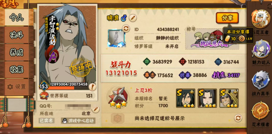 ★39S★58A★1310万战斗力★高招s就剩六道带土、忍战缨、忍战雷没★ 全高招a★ 忍法帖有小胡子、无、金银角、三代雷、半藏、天道超、六尾、五影带土★氪金a有鸡翅、黑绝、爱情哥、新春鼬、泳装照美冥、漂泊再不斩、面麻★通灵熊猫★