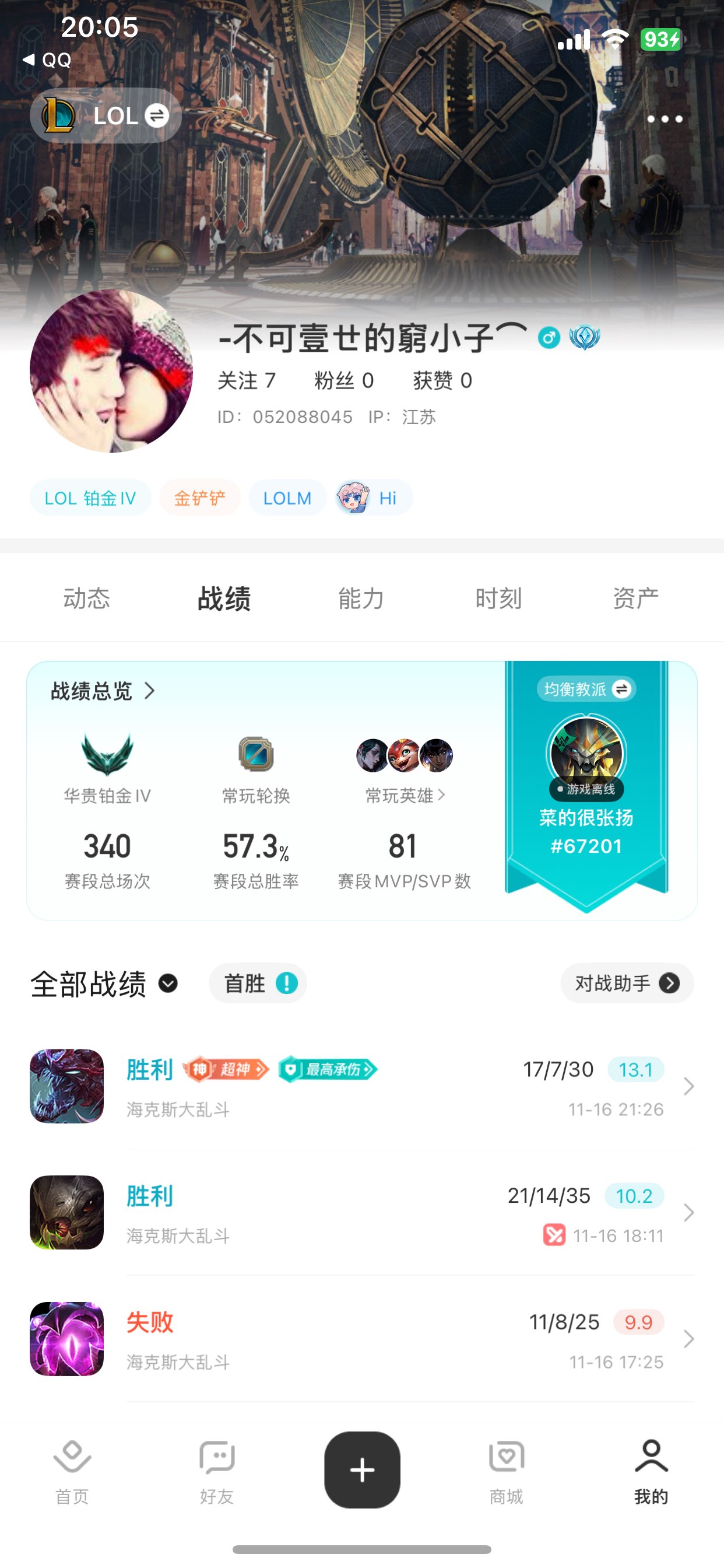 角色等级:447 角色名:菜的很张扬 排位赛:允许 单双排段位:华贵铂金IV 灵活组排段位:- 英雄数量:172 皮肤数量:279 分销起租时长:1 云顶段位:无段位 双人作战段位:无段位