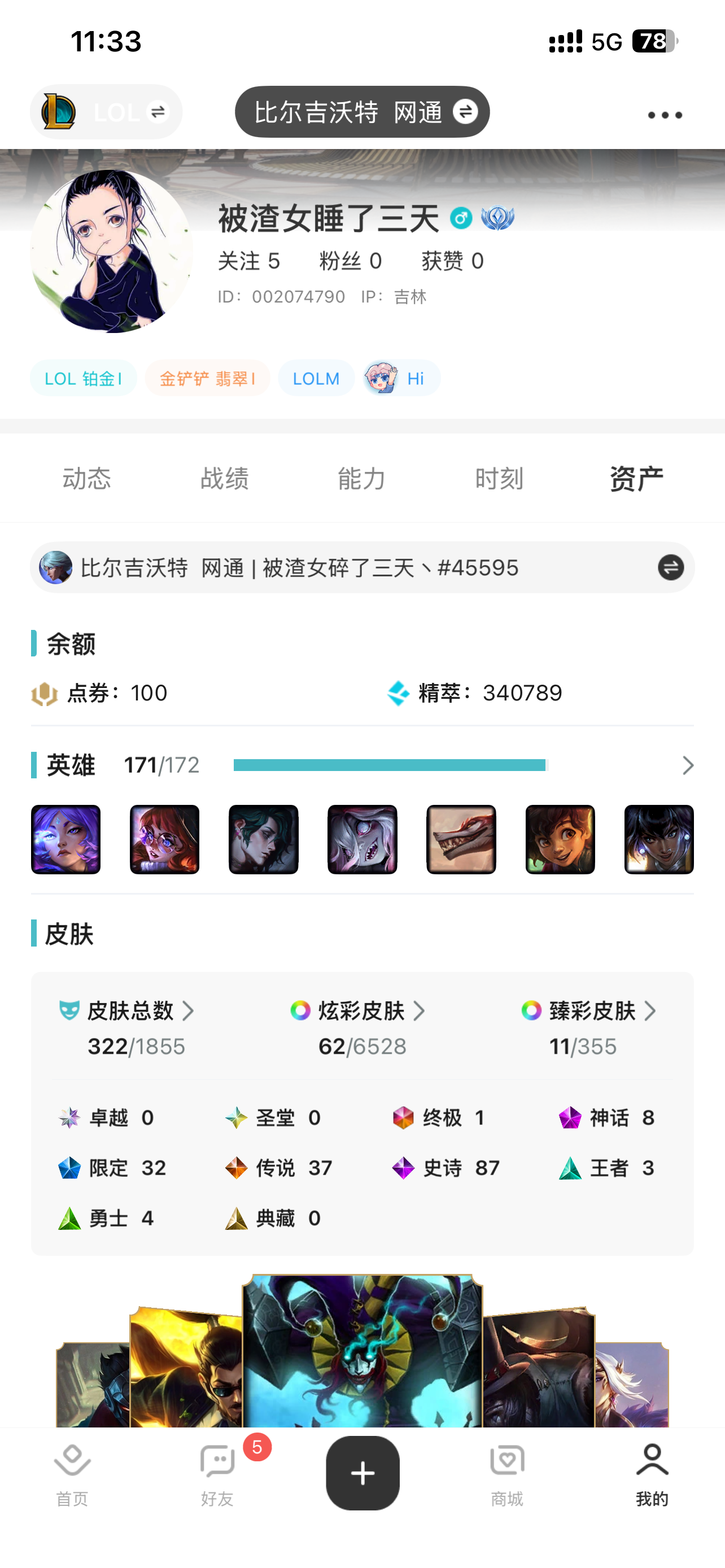 比尔id被渣女碎了三天丶英雄171皮肤322