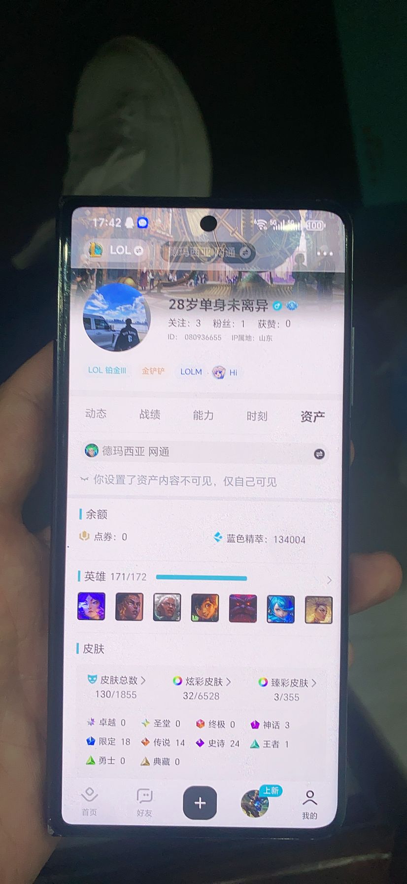 角色等级:422 角色名:28岁单身未离异 排位赛:允许 单双排段位:荣耀黄金I 灵活组排段位:华贵铂金III 英雄数量:172 皮肤数量:131 分销起租时长:1 云顶段位:无段位 双人作战段位:无段位