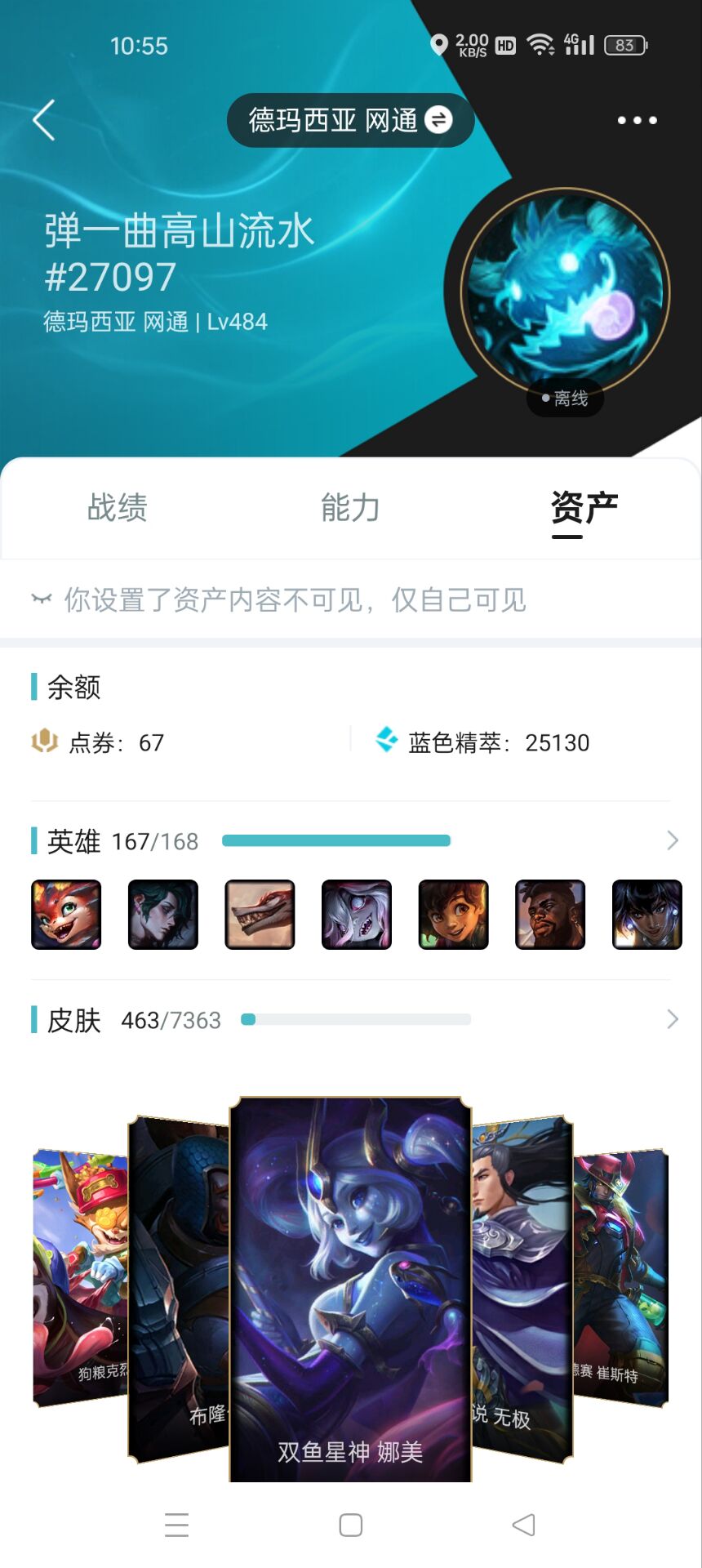 角色等级:534 角色名:弹一曲高山流水 排位赛:允许 单双排段位:华贵铂金II 灵活组排段位:- 英雄数量:172 皮肤数量:402 分销起租时长:1 云顶段位:无段位 双人作战段位:无段位