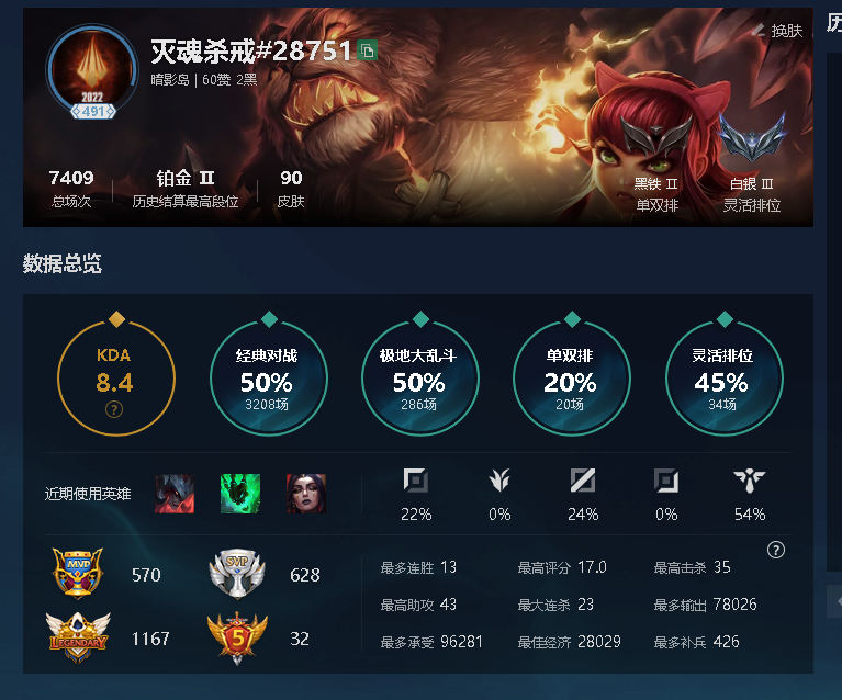 角色等级:494 角色名:灭魂杀戒 排位赛:允许 单双排段位:荣耀黄金IV 灵活组排段位:不屈白银IV 英雄数量:172 皮肤数量:90 分销起租时长:1 云顶段位:无段位 双人作战段位:无段位