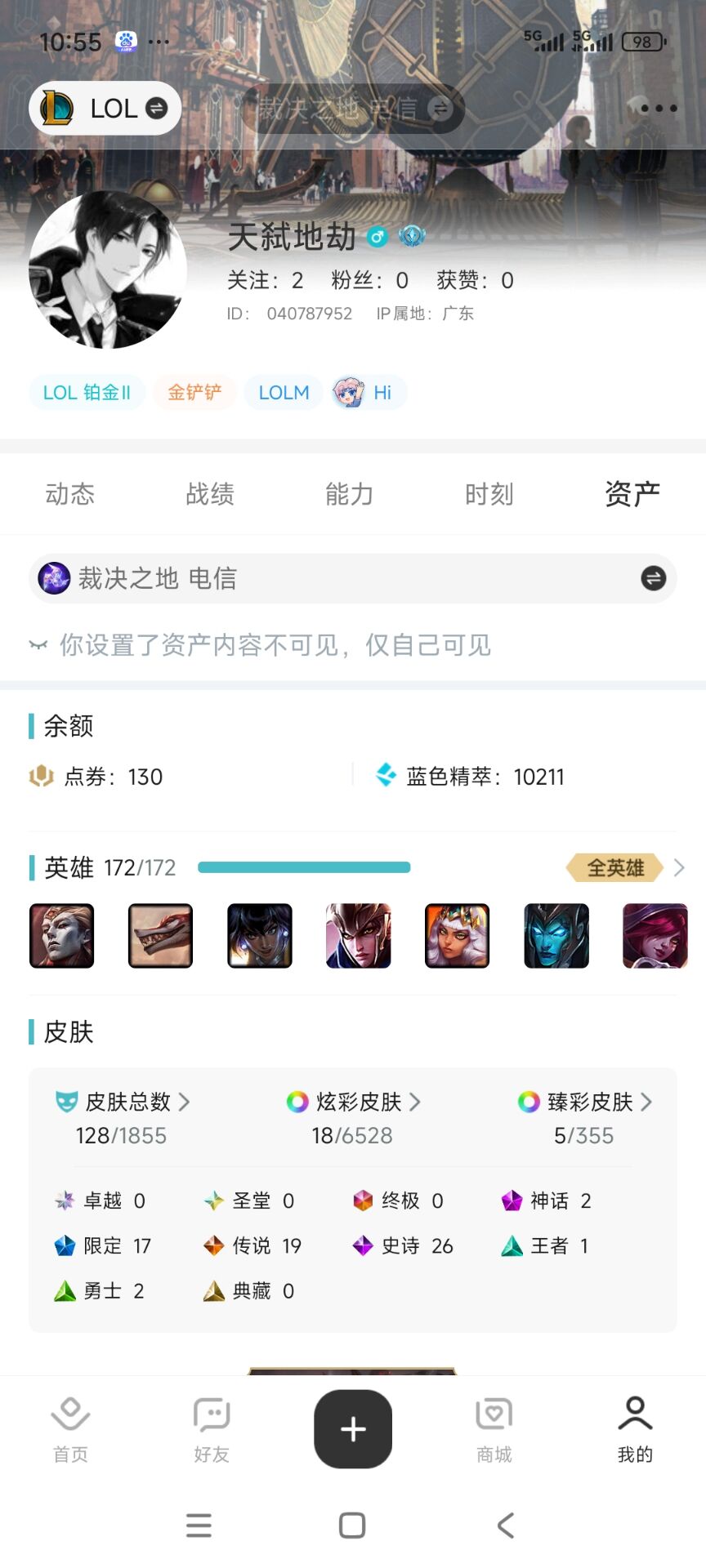 角色等级:273 角色名:传奇中的战神 排位赛:允许 单双排段位:华贵铂金III 灵活组排段位:华贵铂金II 英雄数量:172 皮肤数量:128 分销起租时长:1 云顶段位:无段位 双人作战段位:无段位