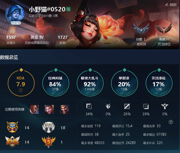 角色等级:1400 角色名:小野猫 排位赛:允许 单双排段位:华贵铂金IV 灵活组排段位:不屈白银I 英雄数量:172 皮肤数量:1735 分销起租时长:1 云顶之弈段位:无段位 双人作战段位:无段位