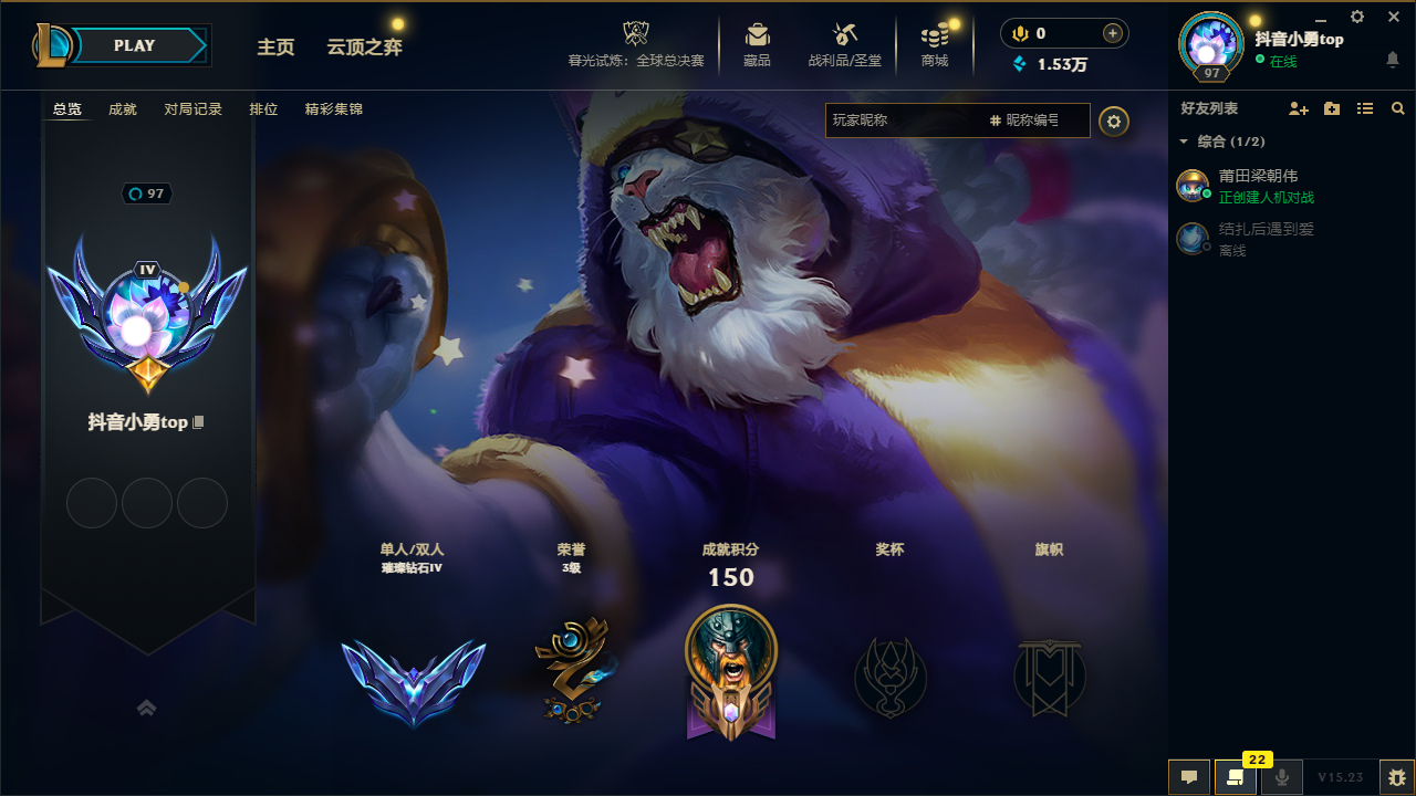 角色等级:98 角色名:抖音小勇top 排位赛:允许 单双排段位:璀璨钻石IV 灵活组排段位:- 英雄数量:105 皮肤数量:47 分销起租时长:1 云顶段位:无段位 双人作战段位:无段位