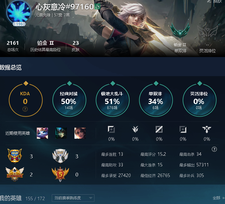 角色等级:198 角色名:心灰意冷 排位赛:允许 单双排段位:华贵铂金II 灵活组排段位:- 英雄数量:156 皮肤数量:23 分销起租时长:1 云顶段位:无段位 双人作战段位:无段位