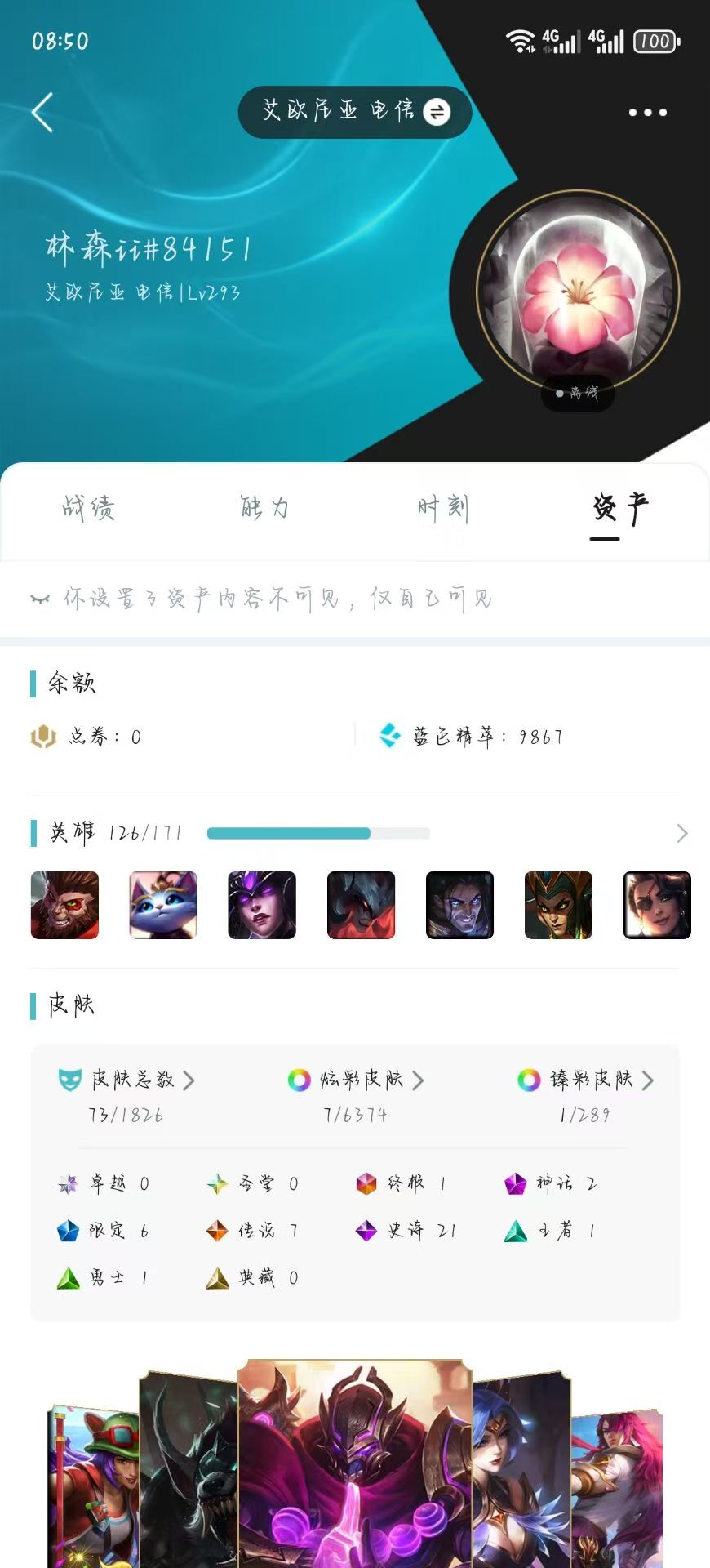 角色等级:302 角色名:林森ii 排位赛:允许 单双排段位:荣耀黄金IV 灵活组排段位:华贵铂金IV 英雄数量:129 皮肤数量:74 分销起租时长:1 云顶段位:无段位 双人作战段位:无段位