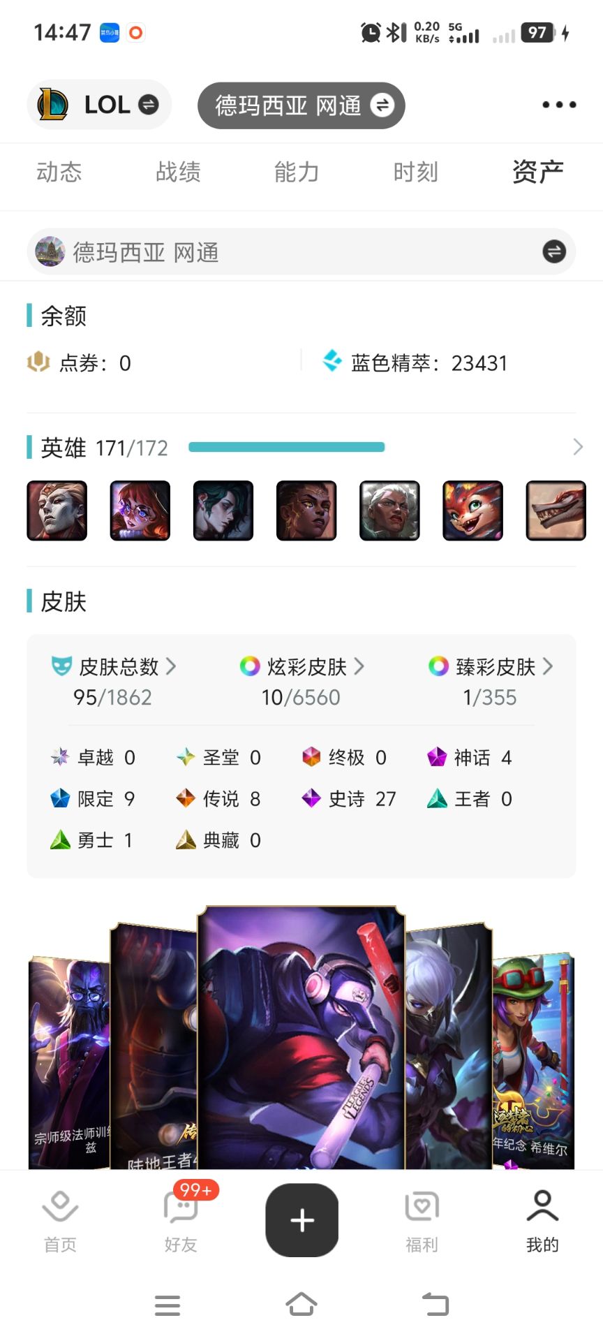 角色等级:347 角色名:QWER接DF 排位赛:允许 单双排段位:- 灵活组排段位:- 英雄数量:171 皮肤数量:95 分销起租时长:1 云顶段位:无段位 双人作战段位:无段位