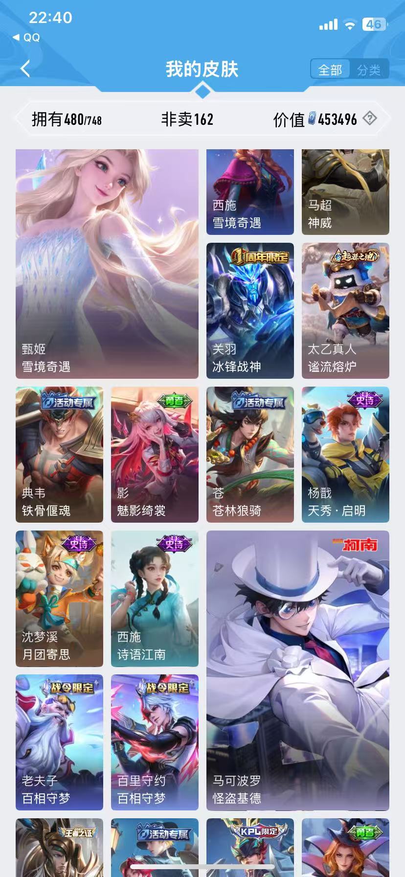S318,V10,480皮肤,裴擒虎祥瑞亨通 韩信弑枪猎影 群星魔术团 马克波罗怪盗基德 甄姬雪境奇遇 澜愿照九州拓 干将画中仙 吕布天魔缭乱怒海麟威 暃埋骨钱朽木白哉