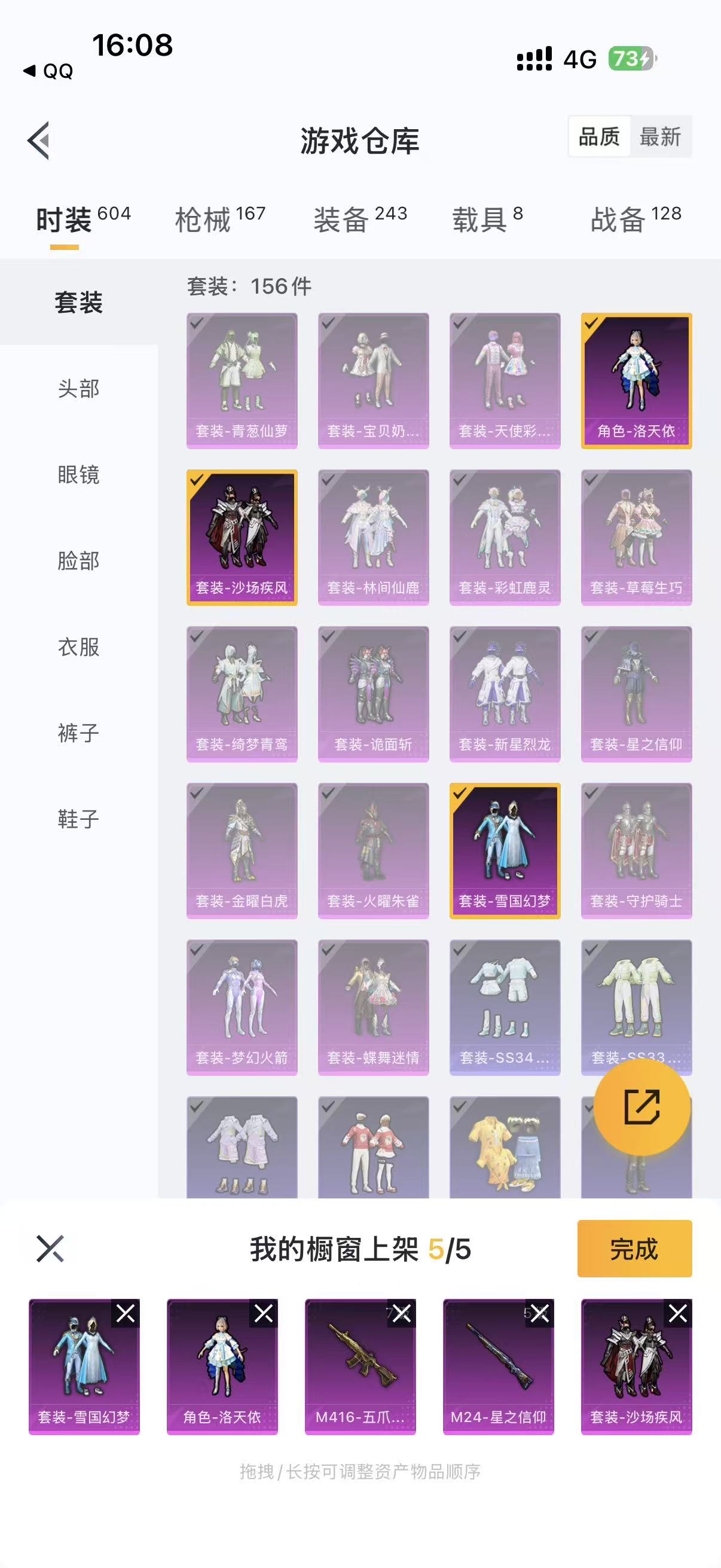 SX491@8载具 轿车兰博基尼灰、玛莎拉蒂粉、蓝,吉普车阿斯顿马丁灰,双人轿跑兰博基尼绿,蹦蹦车2皮肤,摩托车火箭101 1僚机:萌兔起飞 18洛天依、雪国梦幻、卤蛋套装等18套 M4风花雪月5级、五爪金龙7级,98k5级,M24星之信仰5级,MG3洛神2级等 风花雪夜、梦幻火箭等3套