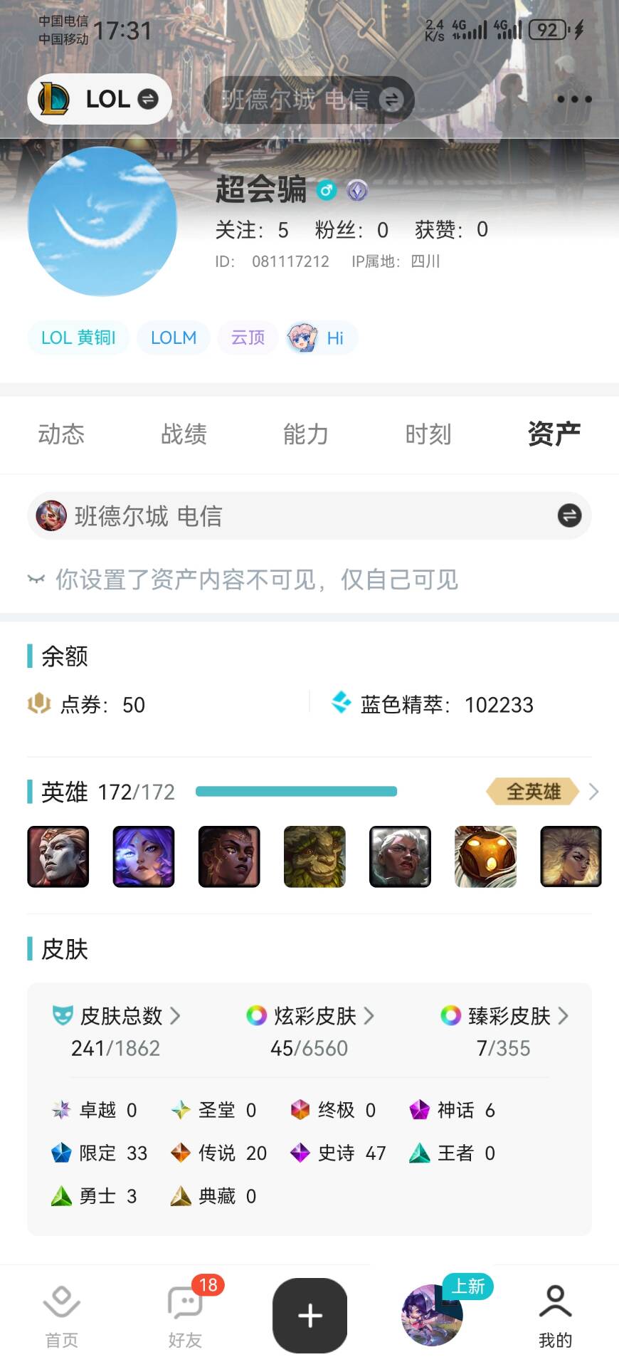 角色等级:398 角色名:超会骗 排位赛:允许 单双排段位:荣耀黄金III 灵活组排段位:荣耀黄金IV 英雄数量:172 皮肤数量:241 分销起租时长:1 云顶段位:无段位 双人作战段位:无段位