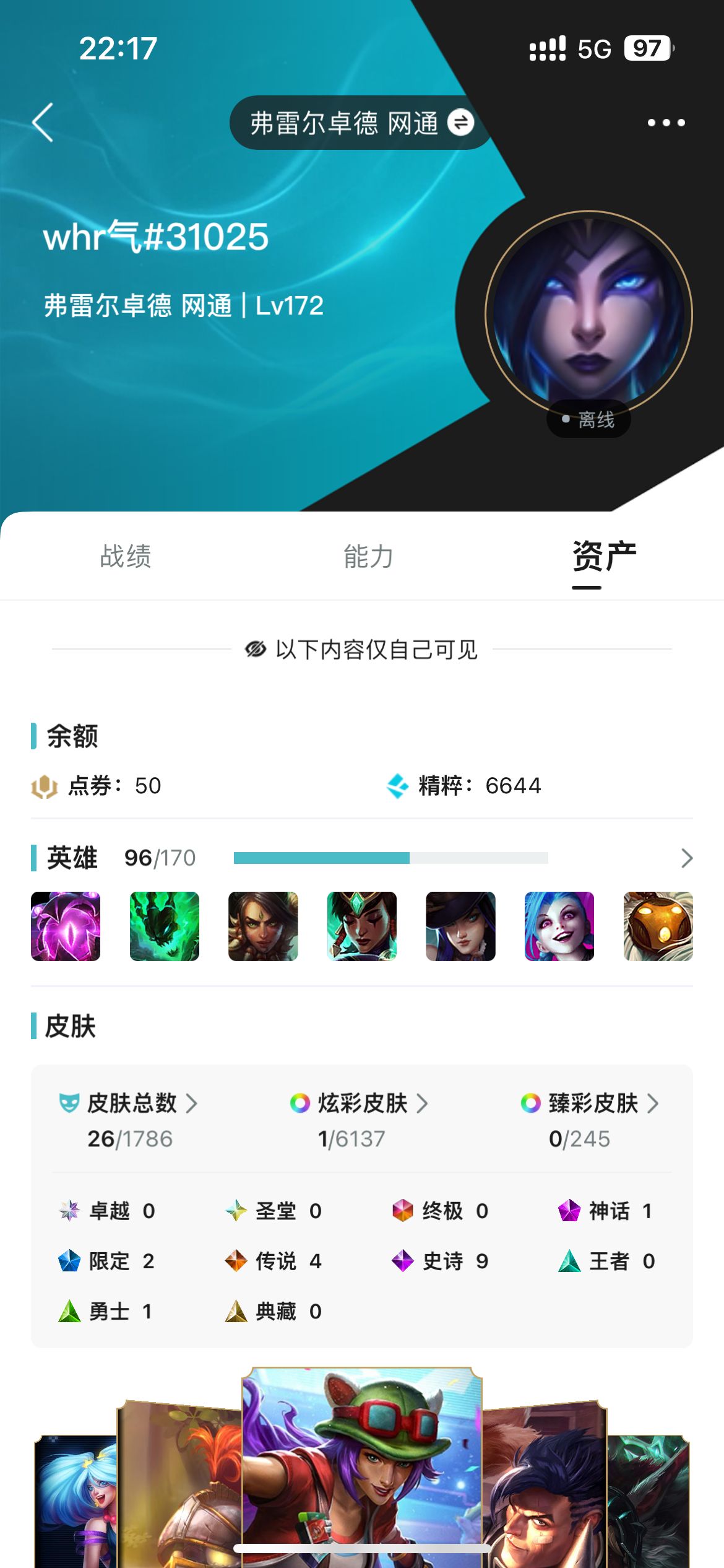 角色等级:174 角色名:whr气 排位赛:允许 单双排段位:不屈白银I 灵活组排段位:- 英雄数量:119 皮肤数量:29 分销起租时长:1 云顶段位:无段位 双人作战段位:无段位