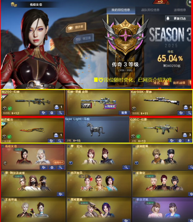 G132██93V,传说女帝,M200幻神,幻神星耀,炽芒蝶刃(蝴蝶刀),98K星神,G36C幻影,6盘6烈,马枪...