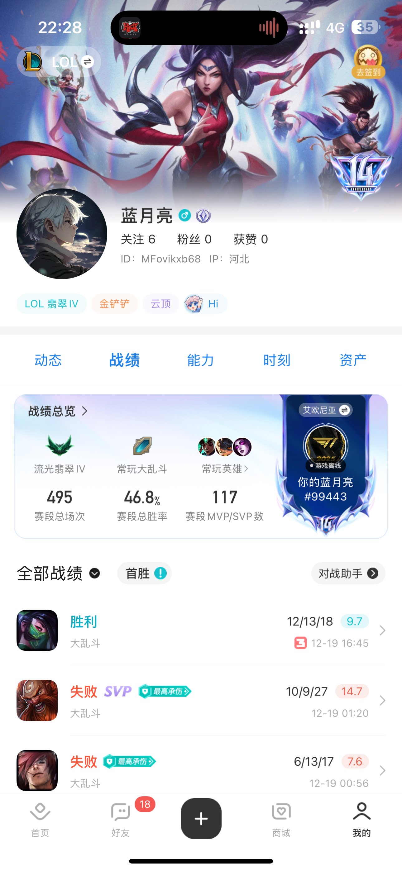 角色等级:58 角色名:你的蓝月亮 排位赛:允许 单双排段位:华贵铂金II 灵活组排段位:流光翡翠IV 英雄数量:117 皮肤数量:21 分销起租时长:1 云顶段位:无段位 双人作战段位:无段位