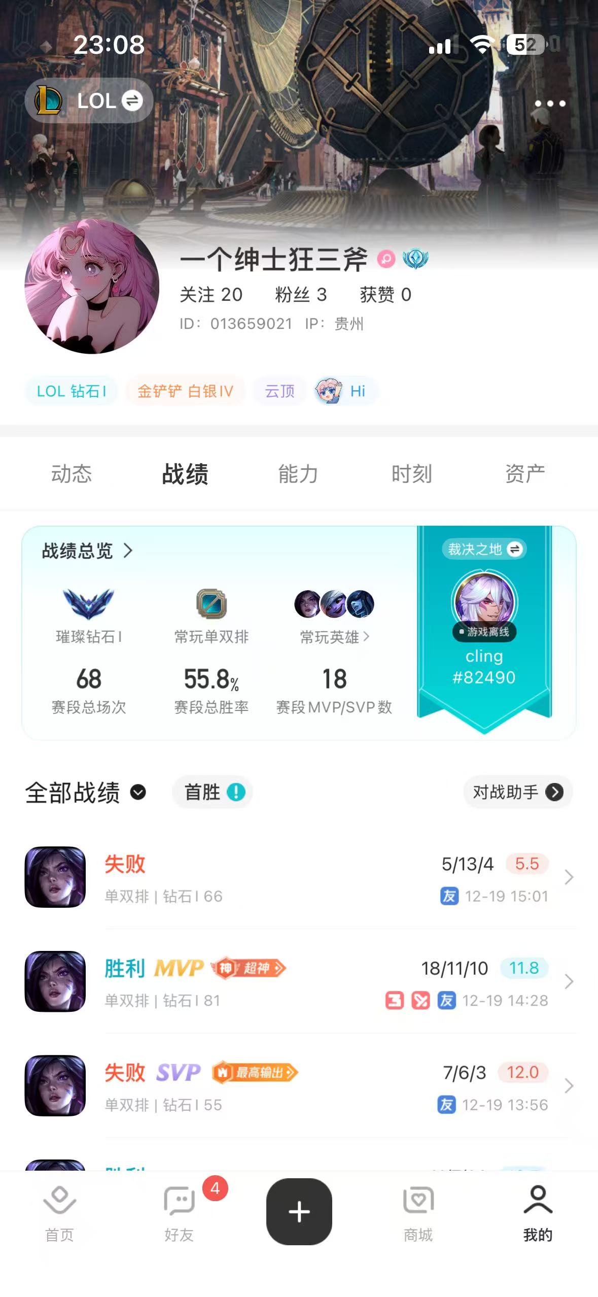 角色等级:94 角色名:cling 排位赛:允许 单双排段位:璀璨钻石Ⅰ 灵活组排段位:流光翡翠Ⅳ 英雄数量:118 皮肤数量:45 云顶段位:坚韧**Ⅱ 分销起租时长:1