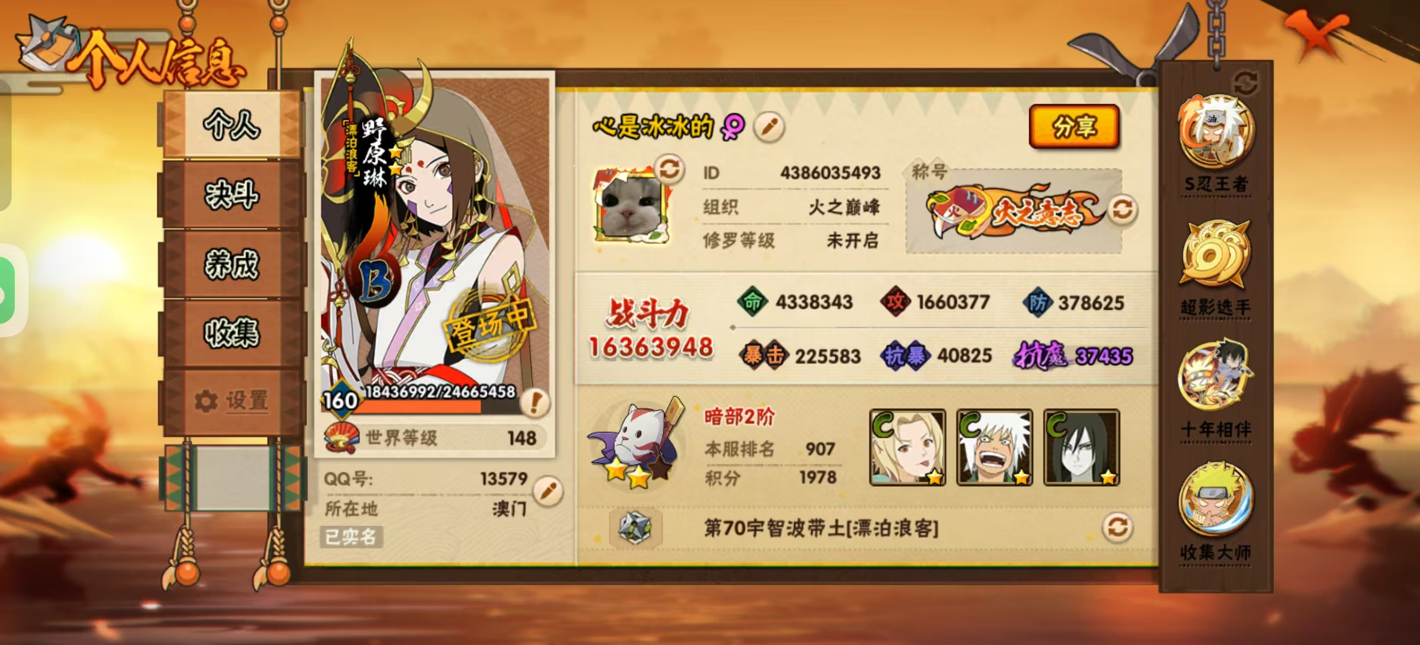 SS798★V13-43S★69A★1636万战斗力★无影会谈斑★侠隐佐助★ 漂泊六道佩恩★ 大筒木舍人★妖怪纲手★须佐止水★天道 超★死门凯★六尾鸣人★九喇嘛 水门★漂泊再不斩★