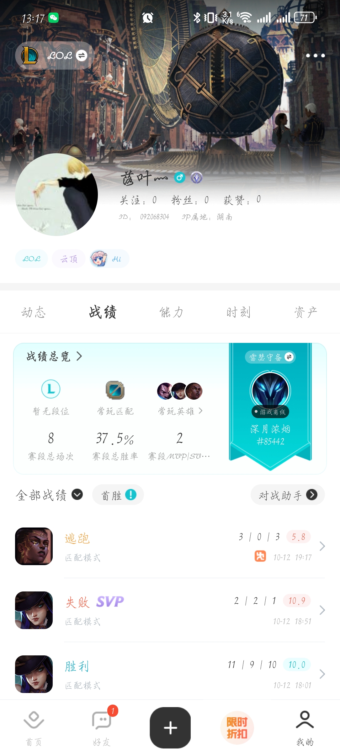 角色等级:42 角色名:深月浓烟 排位赛:允许 单双排段位:- 灵活组排段位:- 英雄数量:85 皮肤数量:32 分销起租时长:1 云顶段位:无段位 双人作战段位:无段位