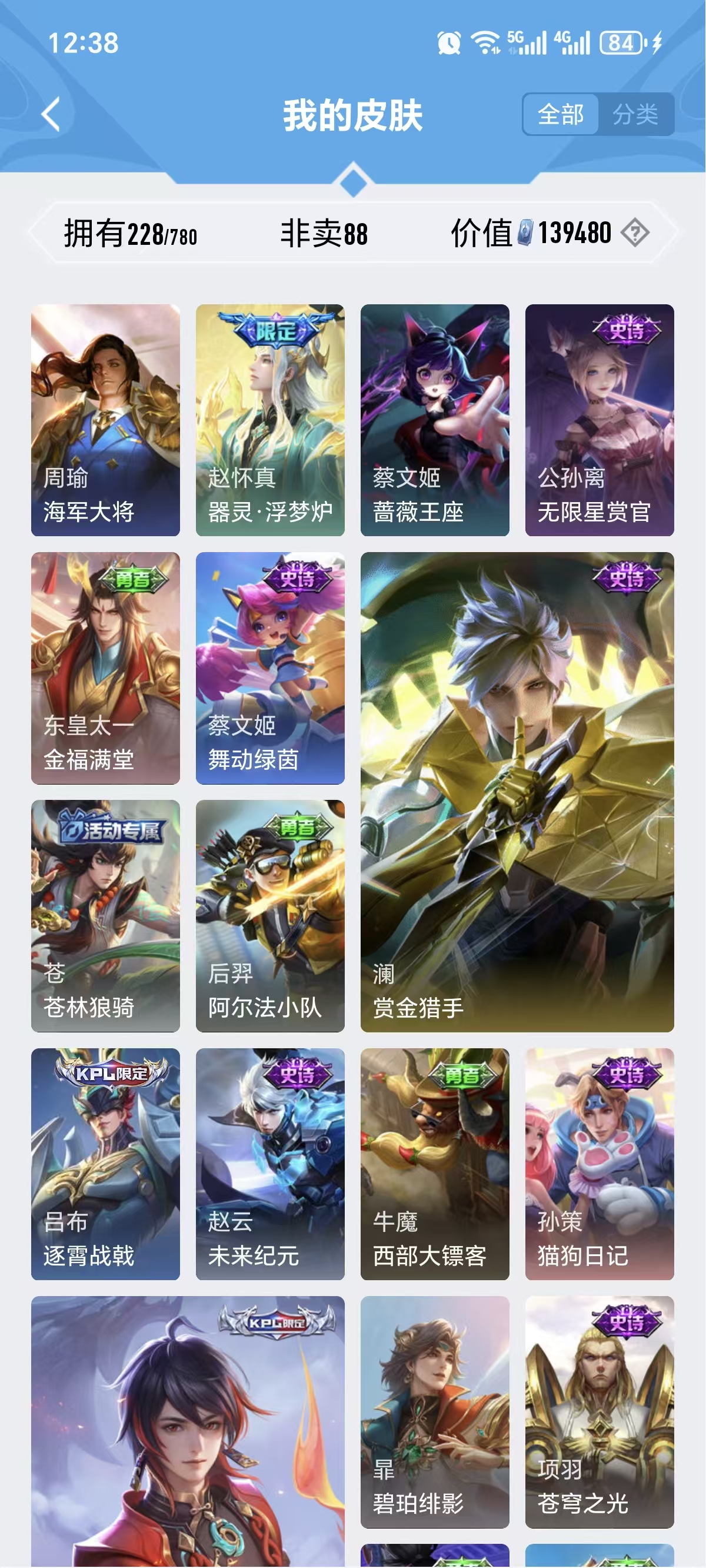 228皮肤,幻光神枪、燃星之曲、无限倾心、山海.炽霜斩、山海.玄木吟、诗剑行、时之祈愿、金色仲夏夜、器灵.浮梦炉...