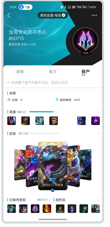 角色等级:191 角色名:卩灬遡罰 排位赛:允许 单双排段位:- 灵活组排段位:- 英雄数量:117 皮肤数量:95 分销起租时长:1 云顶段位:无段位 双人作战段位:无段位