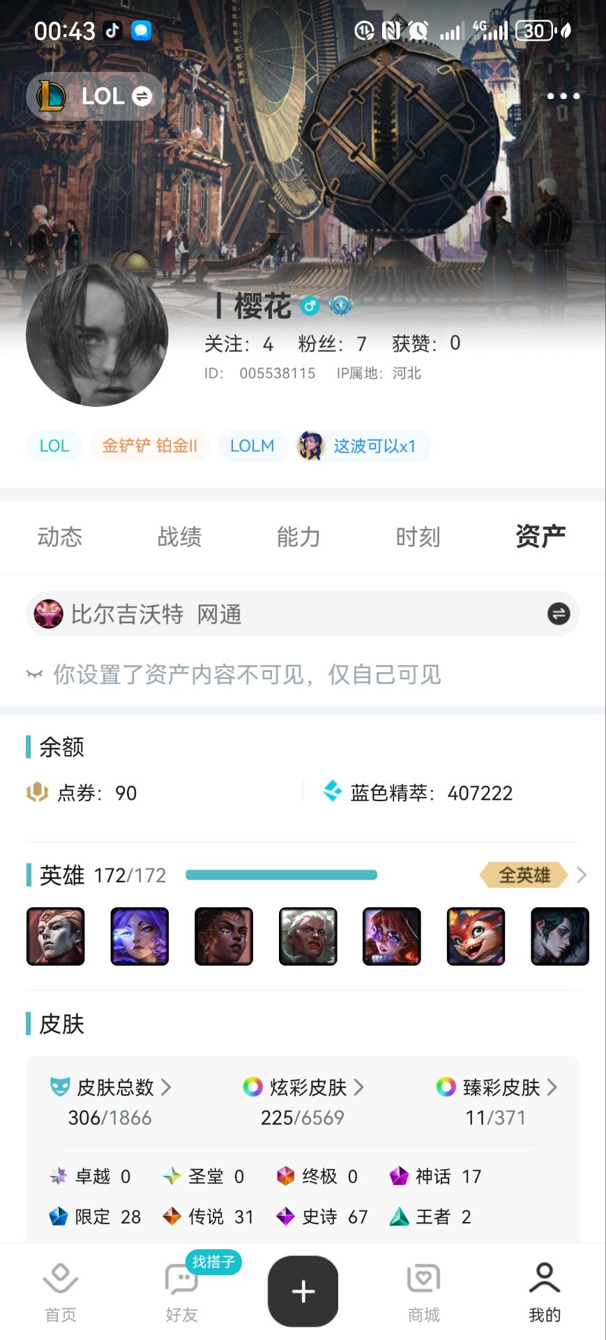 角色等级:1109 角色名:周杰伦 排位赛:允许 单双排段位:流光翡翠II 灵活组排段位:- 英雄数量:172 皮肤数量:319 分销起租时长:1 云顶段位:无段位 双人作战段位:无段位