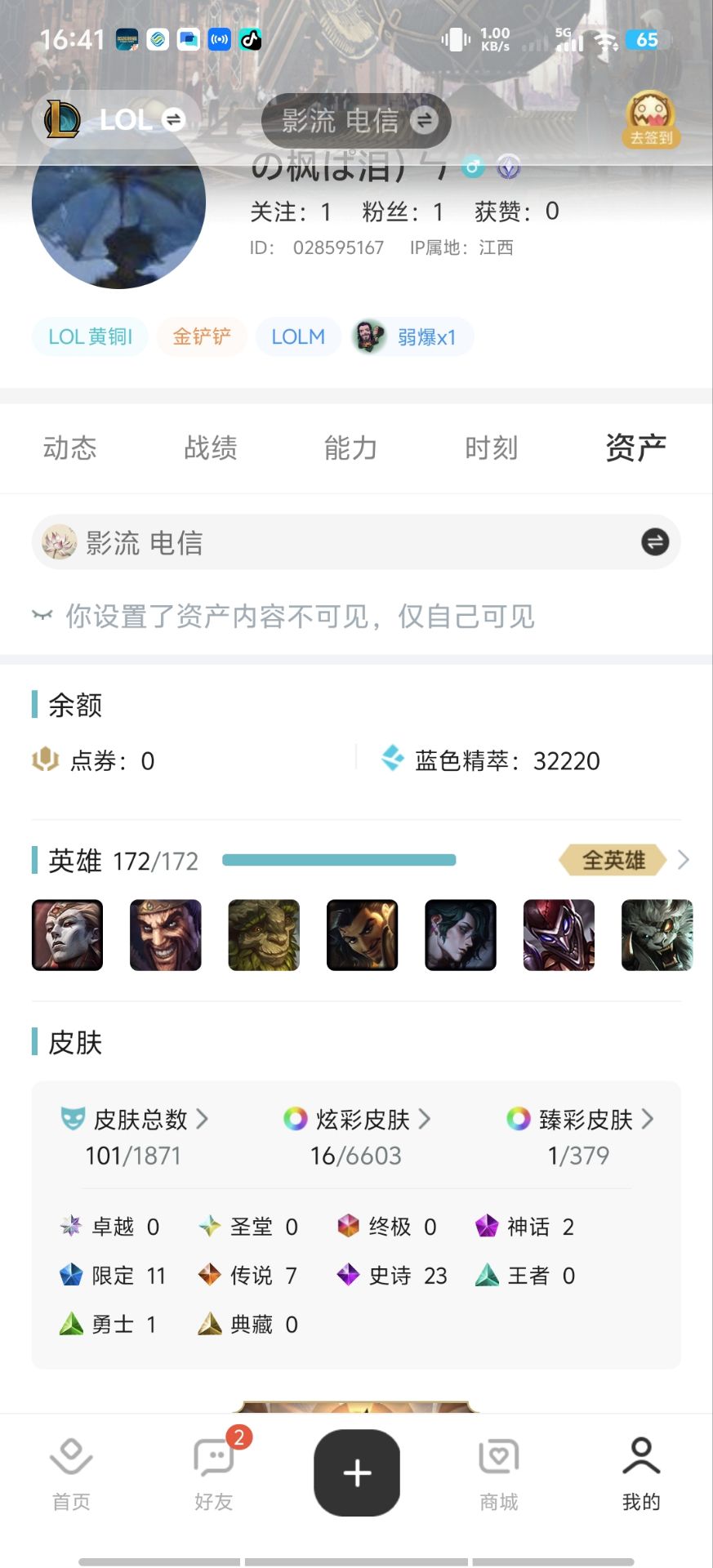 角色等级:219 角色名:偶尔是悲殇 排位赛:允许 单双排段位:璀璨钻石II 灵活组排段位:- 英雄数量:172 皮肤数量:109 分销起租时长:1 云顶段位:无段位 双人作战段位:无段位
