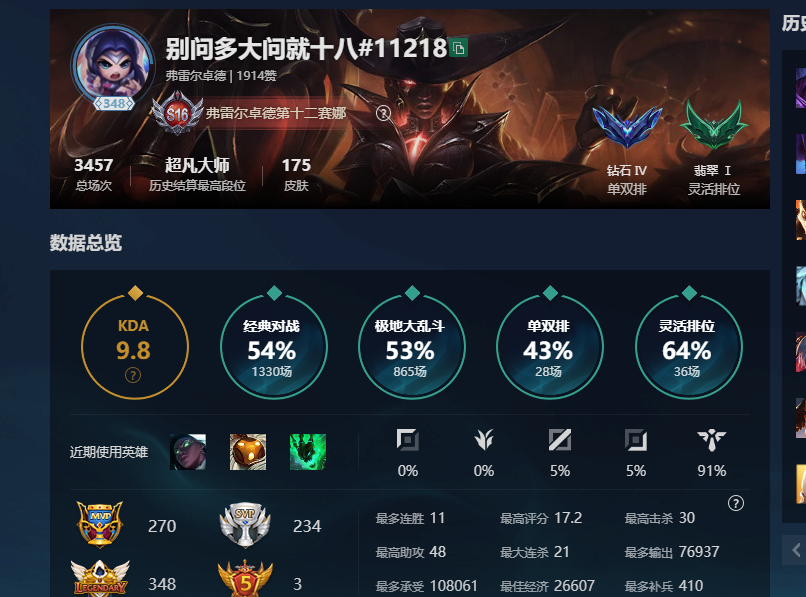 角色等级:358 角色名:别问多大问就十八 排位赛:允许 单双排段位:流光翡翠I 灵活组排段位:流光翡翠I 英雄数量:172 皮肤数量:181 分销起租时长:1 云顶段位:无段位 双人作战段位:无段位