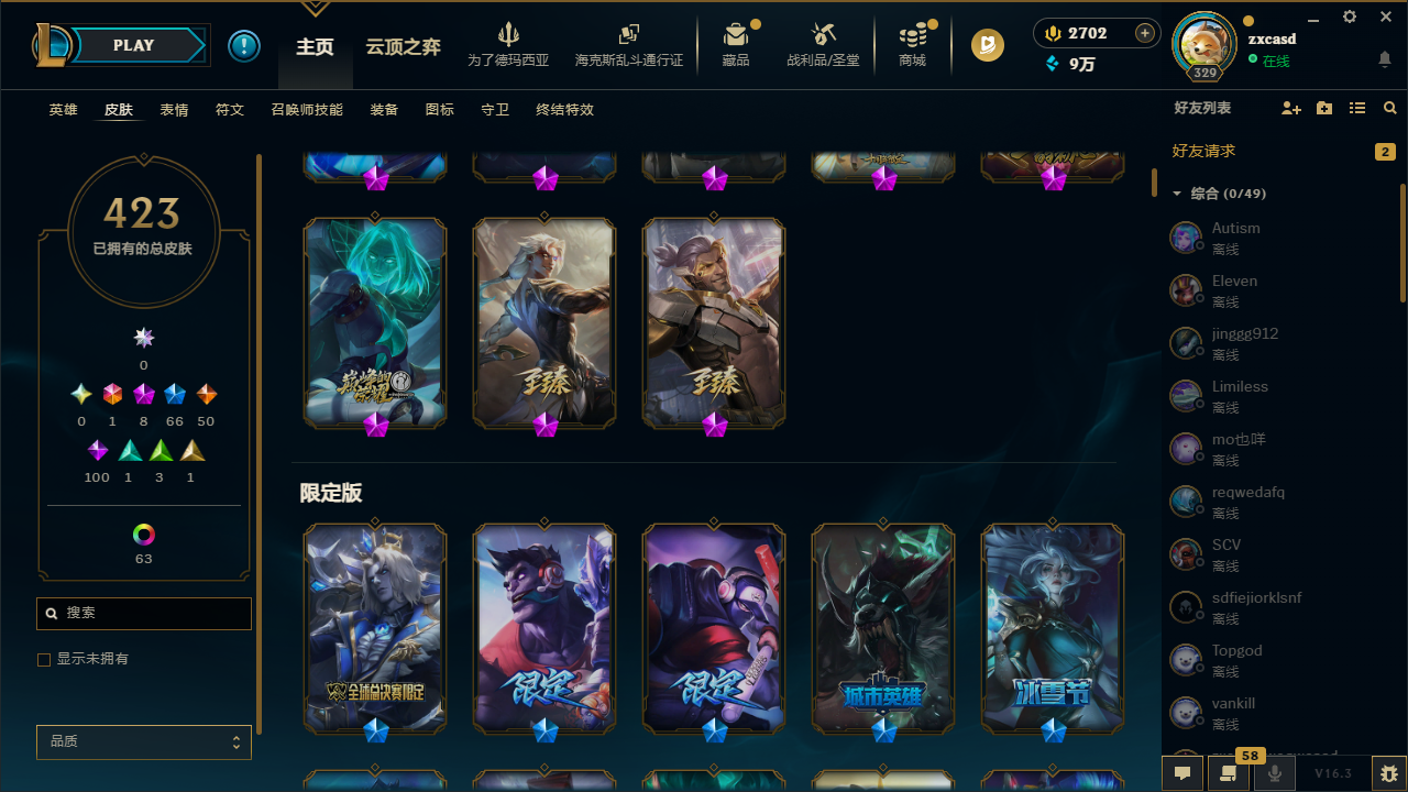 角色等级:335 角色名:zxcasd 排位赛:允许 单双排段位:超凡大师Ⅰ 灵活组排段位:无段位null 英雄数量:172 皮肤数量:489 云顶段位:无段位 分销起租时长:1