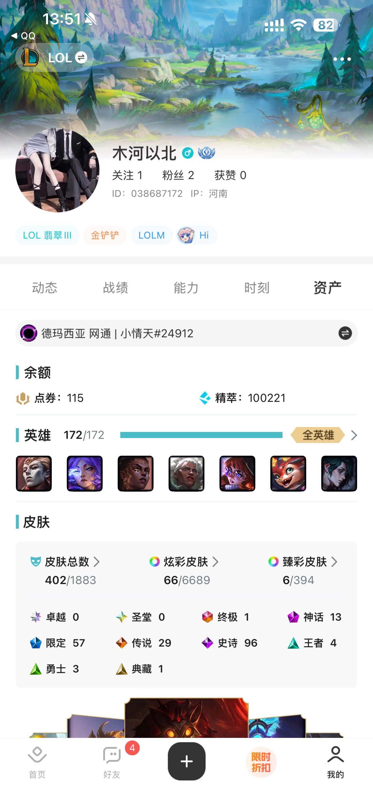 角色等级:561 角色名:小情天 排位赛:允许 单双排段位:璀璨钻石II 灵活组排段位:- 英雄数量:172 皮肤数量:410 分销起租时长:1 云顶段位:无段位 双人作战段位:无段位