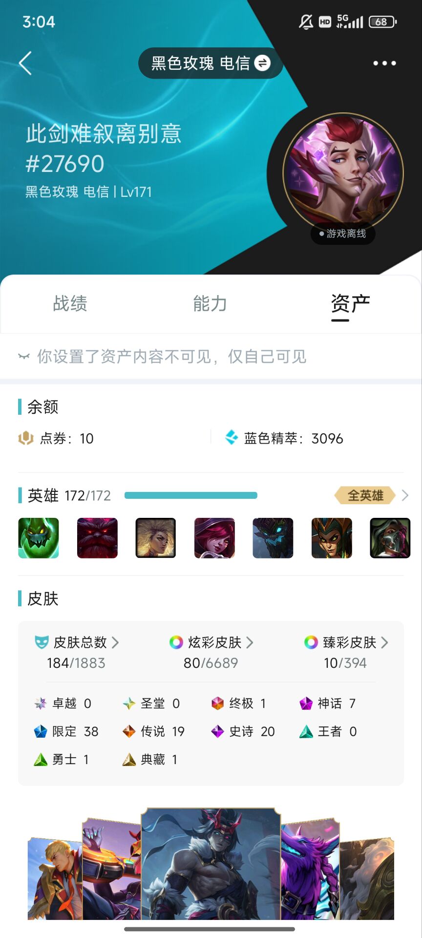 角色等级:185 角色名:此剑难叙离别意 排位赛:允许 单双排段位:华贵铂金I 灵活组排段位:华贵铂金II 英雄数量:172 皮肤数量:201 分销起租时长:1 云顶段位:无段位 双人作战段位:无段位