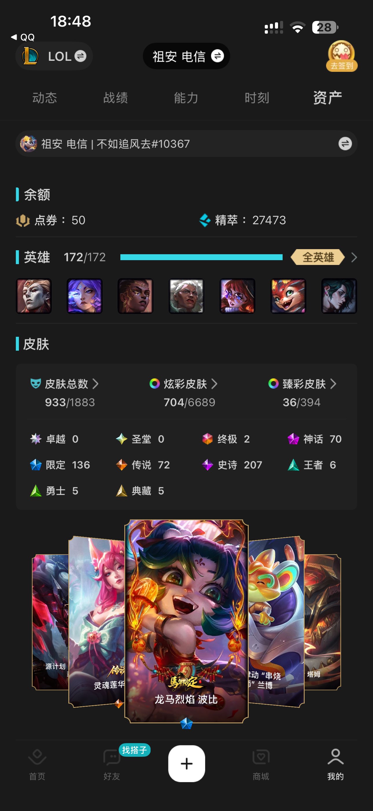 角色等级:1099 角色名:不如追风去 排位赛:允许 单双排段位:超凡大师 灵活组排段位:璀璨钻石IV 英雄数量:172 皮肤数量:942 双人作战段位:英勇黄铜II 分销起租时长:1