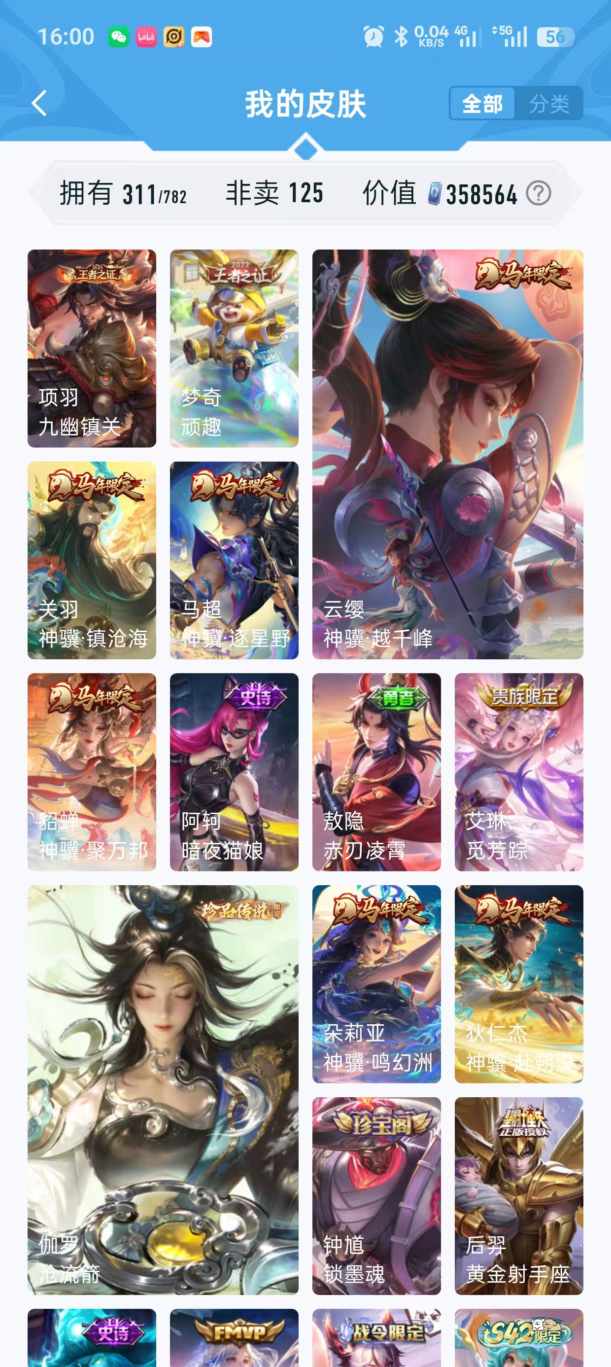 v10 311皮 荣耀典藏 天鹅之梦 千魔归渊 赤影疾锋 幻阙歌 鸣剑.曳影 全息碎影 倪克斯神谕 珍品限定无双 冰雪奇缘 无相 神罪 天机.白泽 沧流箭 黑崎一护 朽木白哉 大耳狗之梦 库洛米之心 珍品无双 馥梦繁花 马年年限6款