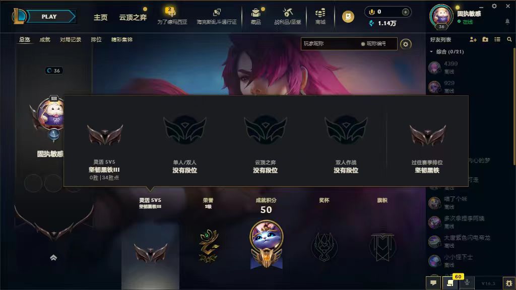 角色等级:43 角色名:来财来财 排位赛:允许 单双排段位:不屈白银Ⅰ 灵活组排段位:坚韧黑铁Ⅳ 英雄数量:130 皮肤数量:9 双人作战段位:无段位 分销起租时长:2