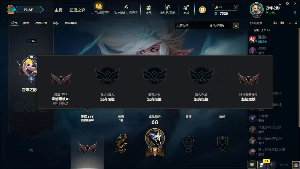 角色等级:33 角色名:咪咪38 排位赛:允许 单双排段位:- 灵活组排段位:坚韧黑铁IV 英雄数量:82 皮肤数量:1 双人作战段位:无段位 分销起租时长:3