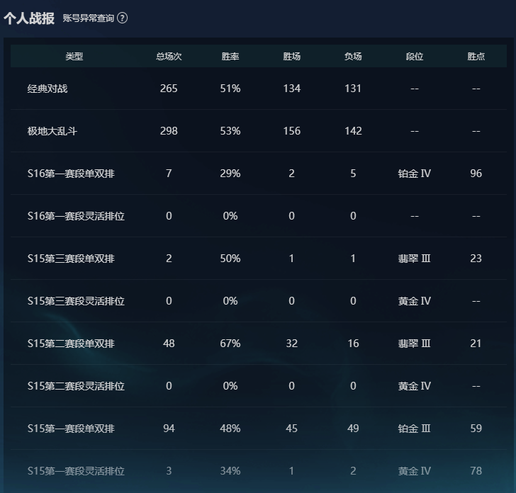 角色等级:132 角色名:落雁睡不醒 排位赛:允许 单双排段位:华贵铂金III 灵活组排段位:- 英雄数量:136 皮肤数量:44 双人作战段位:无段位 分销起租时长:1