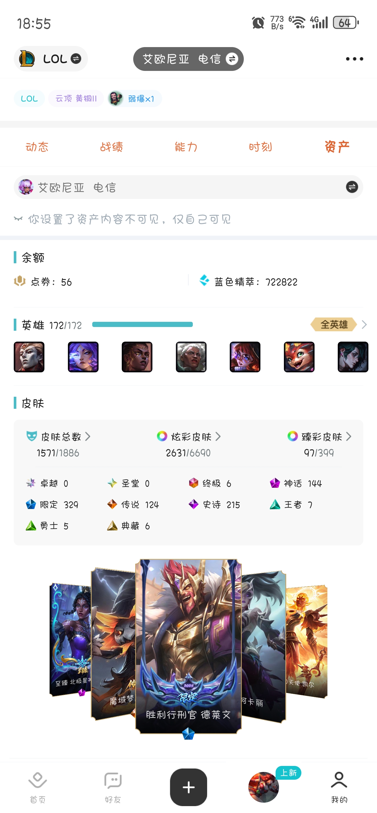 角色等级:3021 角色名:林下神仙 排位赛:允许 单双排段位:璀璨钻石I 灵活组排段位:璀璨钻石IV 英雄数量:172 皮肤数量:1590 双人作战段位:英勇黄铜II 分销起租时长:1