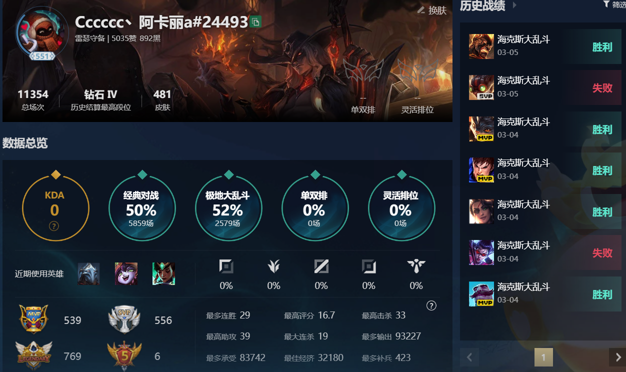 角色等级:556 角色名:Cccccc丶阿卡丽a 排位赛:允许 单双排段位:流光翡翠IV 灵活组排段位:- 英雄数量:171 皮肤数量:485 分销起租时长:2 云顶段位:无段位 双人作战段位:无段位