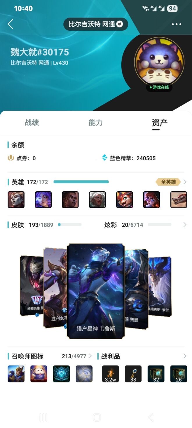 角色等级:436 角色名:魏大就 排位赛:允许 单双排段位:华贵铂金Ⅳ 灵活组排段位:无段位null 英雄数量:172 皮肤数量:214 分销起租时长:1 云顶段位:无段位 双人作战段位:坚韧黑铁II